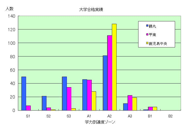①鶴丸高校の大学合格実績では、S1がS2より多くなっているが、鹿児島大学医学部15人(偏差値76)とS1の底辺層でS2上位層に近い層も多い。