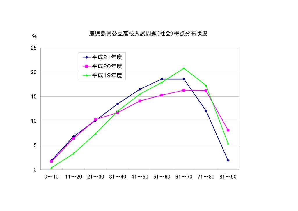標準偏差を得点分布から試算してみると、平成19年度が16.9だったの対して、平成20年度19.7、平成21年度17.8となっており、平成21年度、若干標準偏差が小さくなった。