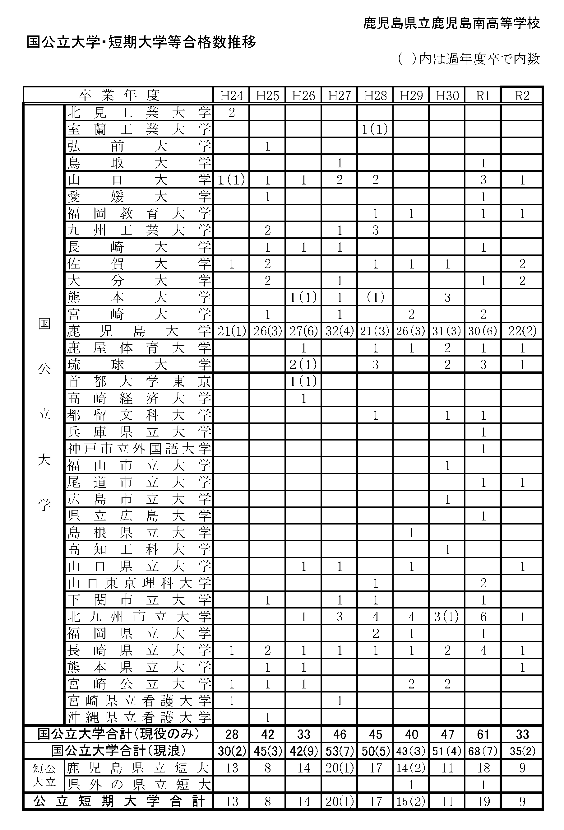 平成24年度の大学別現役・浪人合格者数は不明ですので、ここでは現役合格者5人はすべて鹿児島大学として整理しています。