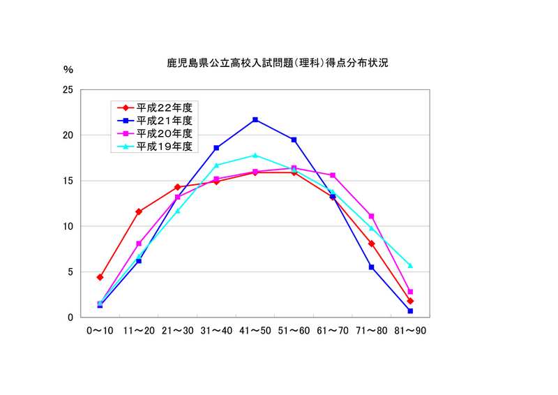 標準偏差を得点分布から試算してみると、平成19年度が21.9だったの対して、平成20年度19.3、平成21年度19.7と小さくなっている。